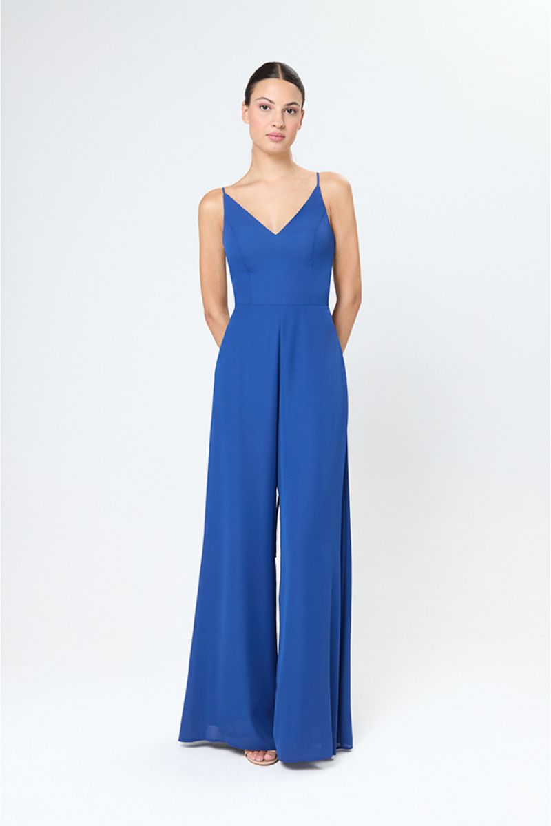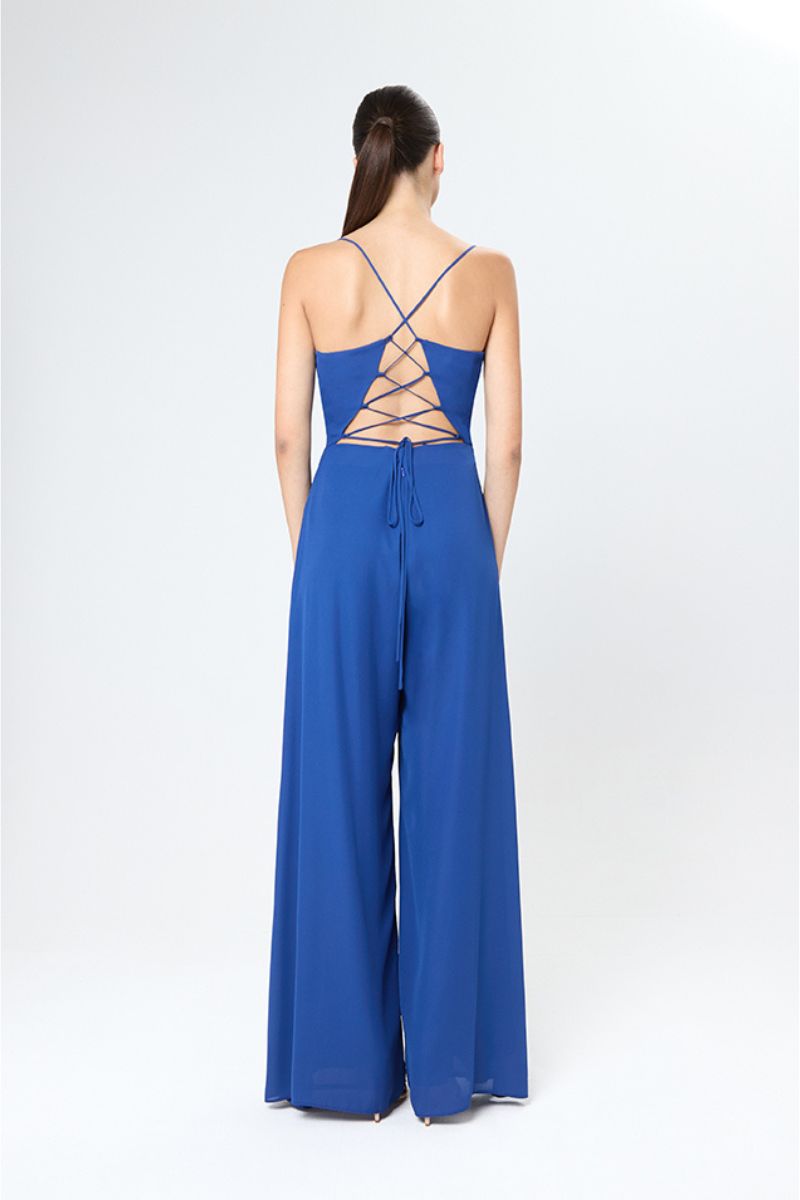 Este mono de diseño elegante y sofisticado es perfecto para cualquier evento formal como bodas, bautizos o comuniones. Su hermoso color azul o verde realza la figura, mientras que el corte amplio de las piernas le aporta un toque moderno y fluido. El escote en V y los tirantes finos añaden un toque femenino y delicado, mientras que la espalda abierta con el detalle de tiras cruzadas le da un giro único y muy actual. Este mono es ideal para quienes buscan un look que combine comodidad y estilo para ocasiones especiales. ¡Un clásico moderno para destacar en tu próximo evento! Diseñado y confeccionado con los mejores tejidos en España.