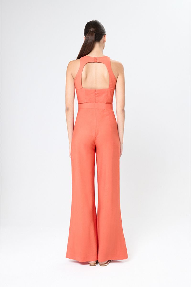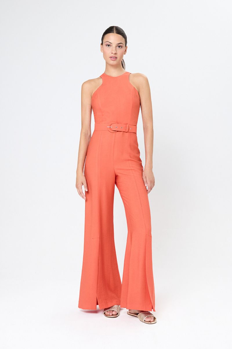Elegante mono de fiesta ideal para ese día tan importante, con una espalda muy sensual y cortes en bajos de pantalón y con un cinturón a juego. Diseñado y confeccionado en España con los mejores tejidos.