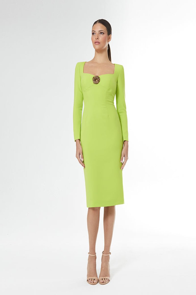 Elegante vestido de fiesta con escote cuadrado y aplique en centro del pecho tipo broche. Un vestido cortado bajo pecho y recto con manga larga y un original color amarillo/lima. Confeccionado y diseñado en España.
