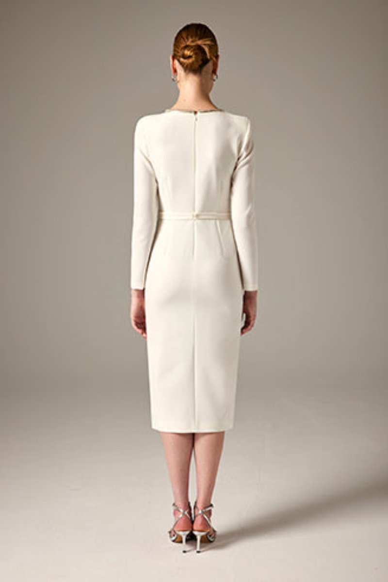 Elegante vestido de fiesta, escote asimétrico con detalle de cadena que le da un toque muy original. Falda con corte en parte delantera. Moda española, diseñada y confeccionada en España con los mejores tejidos.