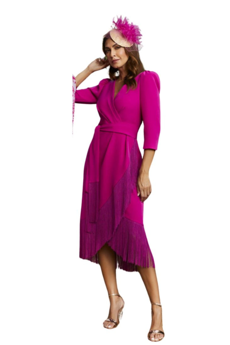 Vestido de fiesta con escote cruzado y manga larga, falda cruzada con detalle de flecos en cascada. Moda joven diseñada y confeccionada en España.