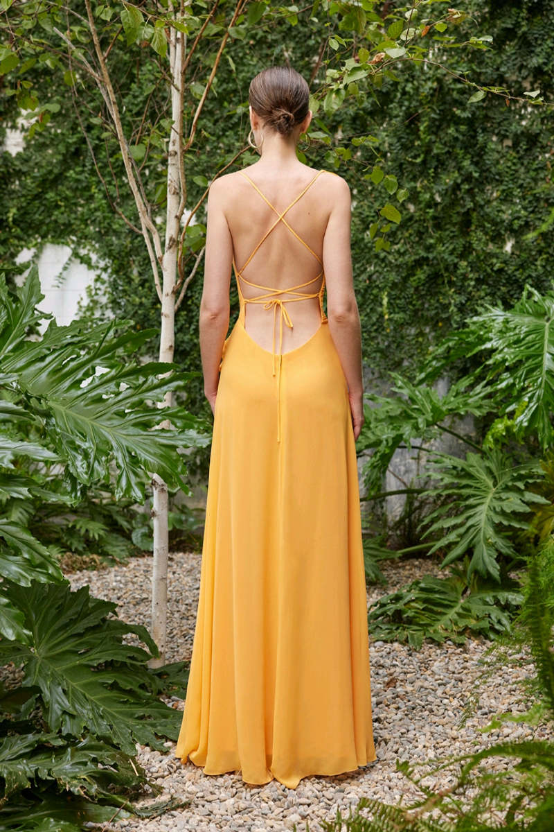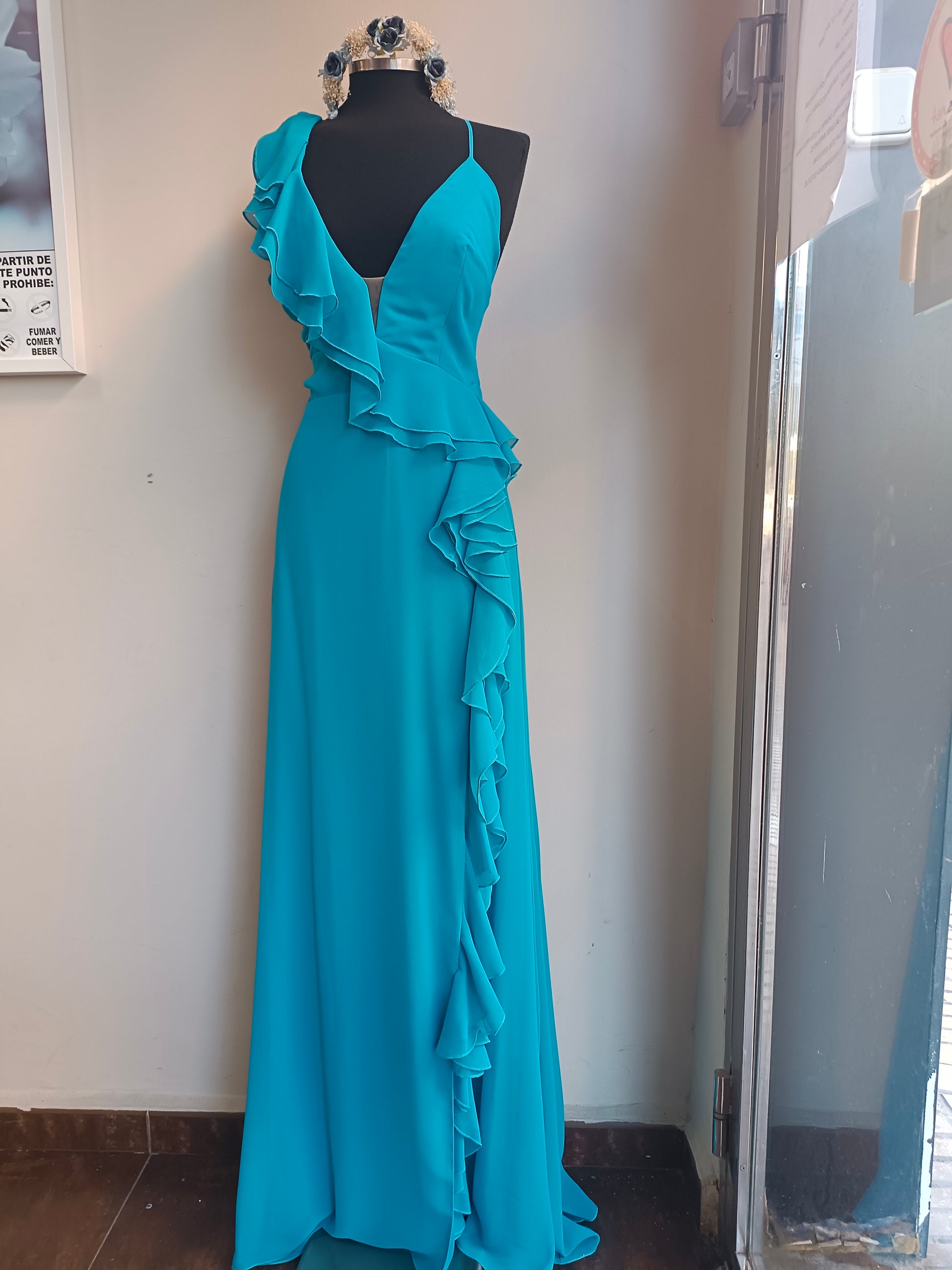 Sensual vestido de fiesta largo con detalles de volantes estratégicamente colocados, con un escote pronunciado y una espalda muy descubierta con tiras finas entrelazadas. La falda vaporosa con mucha caída tiene una abertura justo encima de una pierna. Un vestido con un increíble diseño. Diseño by Carla Ruiz, moda española de alta calidad.