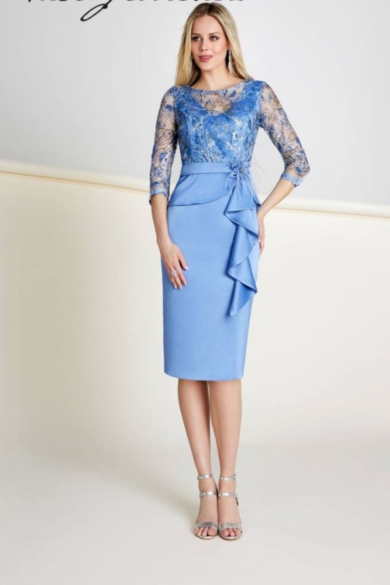 Elegancia y sofisticación personalizada en nuestro exclusivo vestido de madrina, perfecto para la madre del novio o novia en ese día tan especial. Este exquisito diseño combina a la perfección la delicadeza del encaje con sutiles lentejuelas, creando un look deslumbrante y refinado. El cuerpo de este magnífico vestido presenta un encaje delicado que añade un toque de romanticismo, resaltando la feminidad de quien lo lleva. Las mangas francesas y la falda recta con un detalle de peplum que realza la silueta con estilo. Una cascada en el lateral añade movimiento a la prenda. Este vestido es la elección perfecta si deseas deslumbrar con clase y estilo. Moda Española