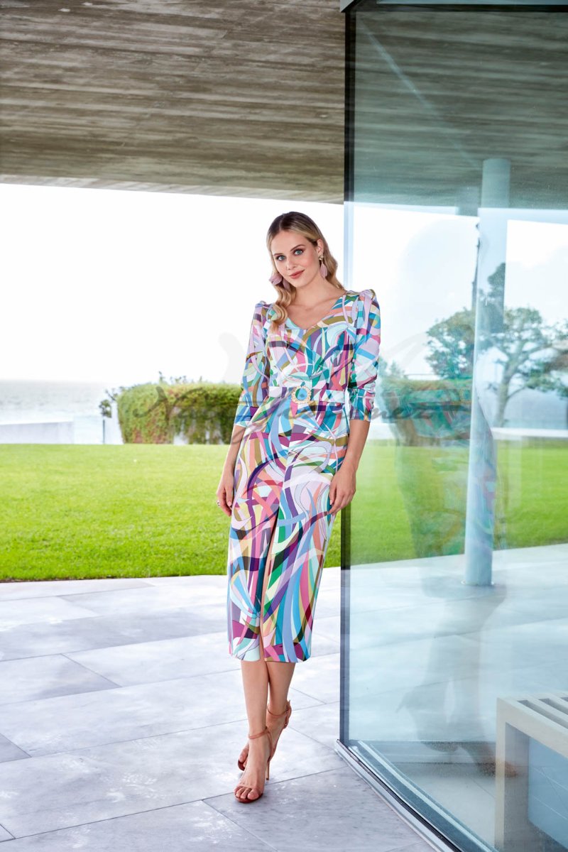 Vestido de fiesta midi, cote recto con manga larga y escote en V. Corte en parte delantera de la falda y cinturón a juego con detalle de hebilla. Moda Española confeccionada y diseñada en España.