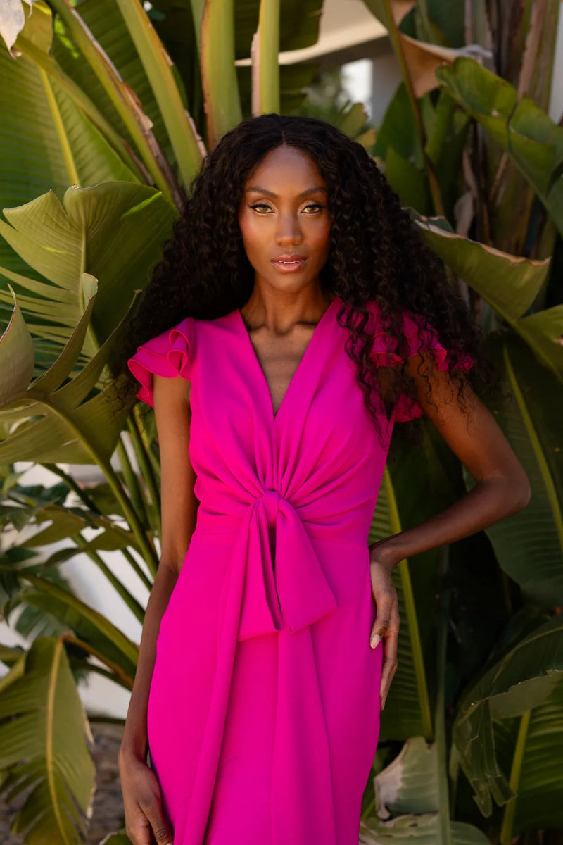 Delicado vestido con escote V, manga corta y un lazo para destacar la cintura, es un vestido que favorece la silueta y la realza. Con este vestido robaras miradas. Diseñado y confeccionado en España.