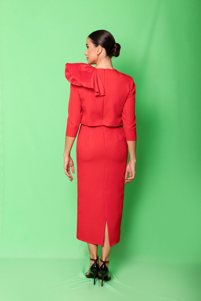 Vestido con efecto dos piezas, con gran volante a modo de cascada en el hombro que llega has la cadera en tafetán. Un modelo muy original y llamativo, ideal para mama de comunión. Moda Española con tejidos de calidad